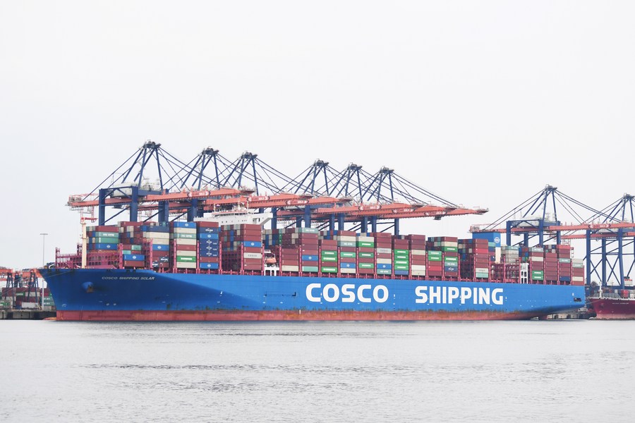A container ship of China's COSCO Shipping docks at the Port of Rotterdam, the Netherlands, May 1, 2023. The Chinese-made solar-powered equipment installed in Dirk's house arrived by sea at the Port of Rotterdam before being transferred to Germany. (Xinhua/Ren Pengfei)