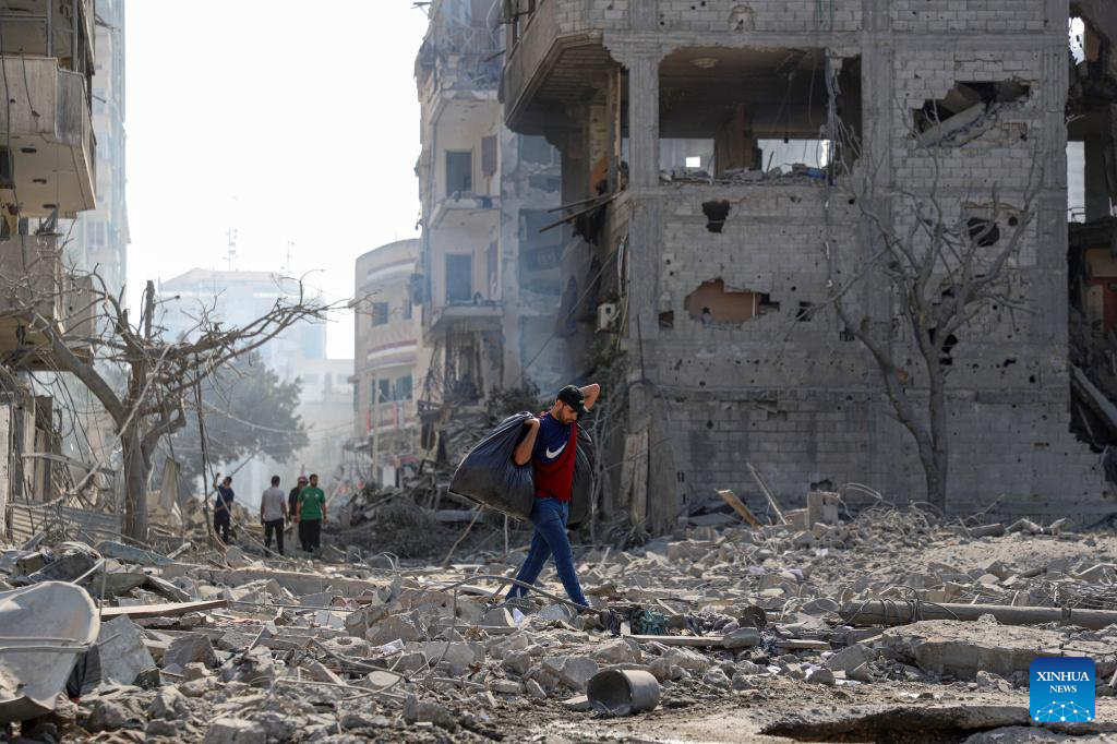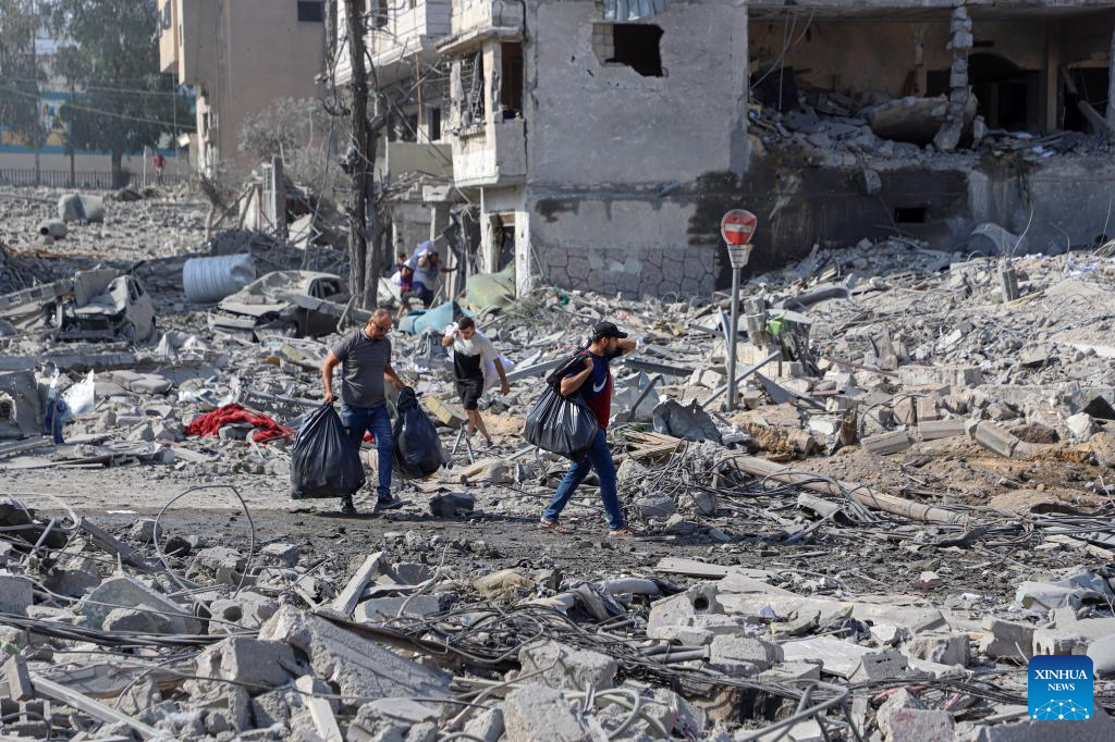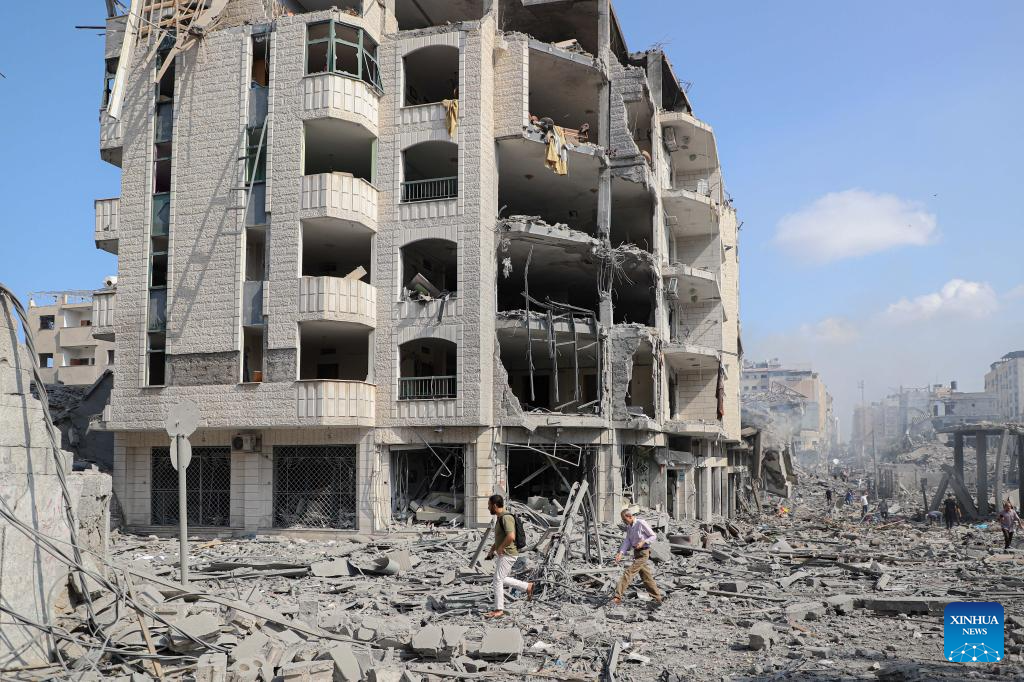 People walk past destroyed buildings following an Israeli airstrike in Gaza City on Oct. 10, 2023. The death toll and injuries from Israeli attacks on the Gaza Strip have risen to 687 and 3,726, respectively, according to the latest update by the Palestinian Health Ministry on Monday. (Photo by Rizek Abdeljawad/Xinhua)