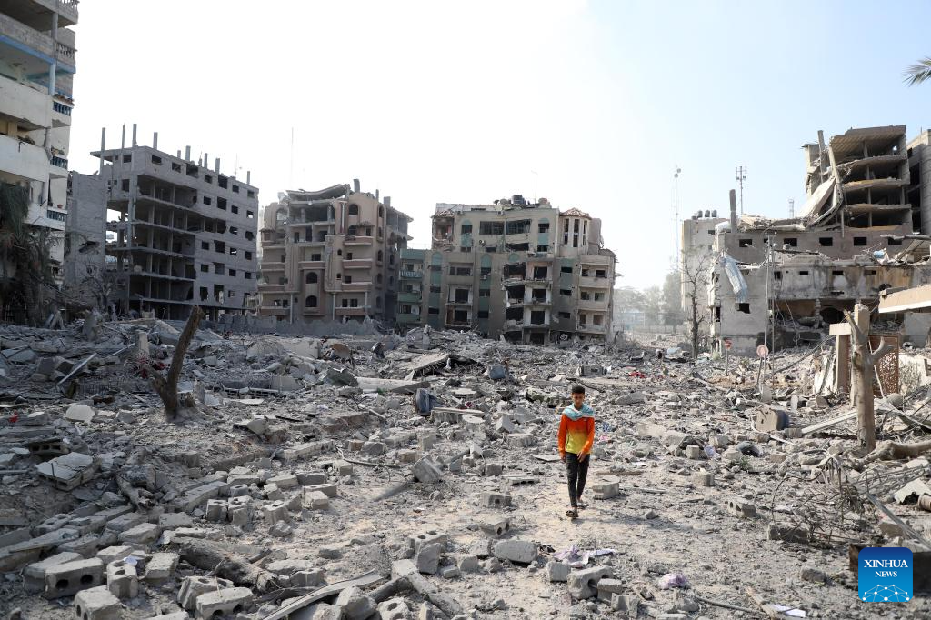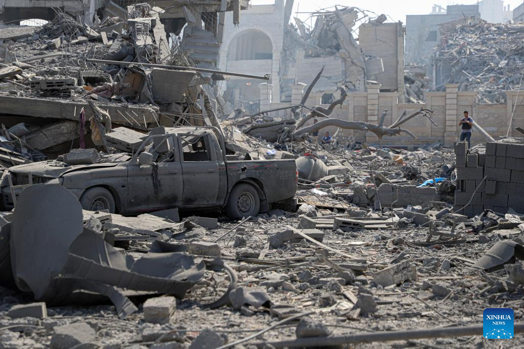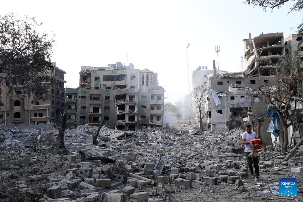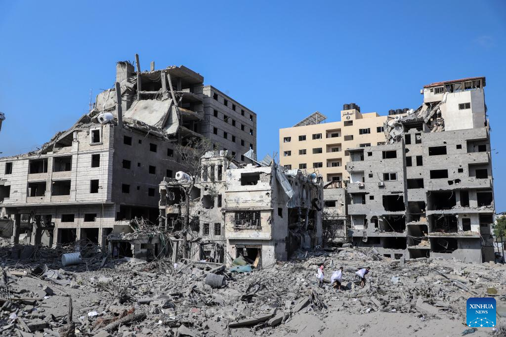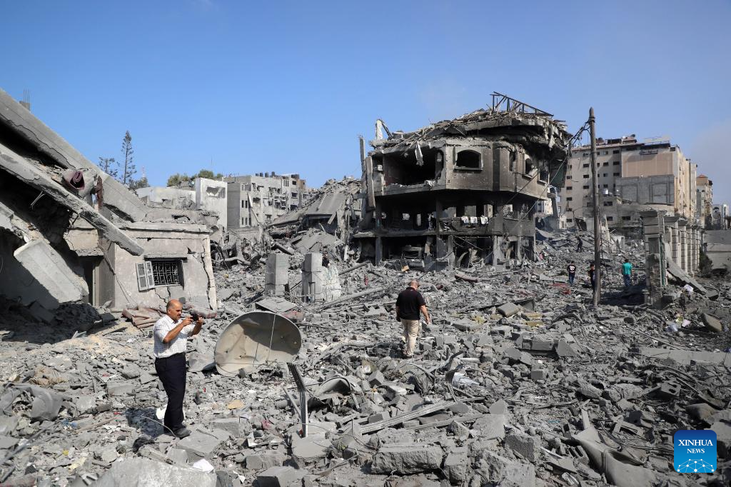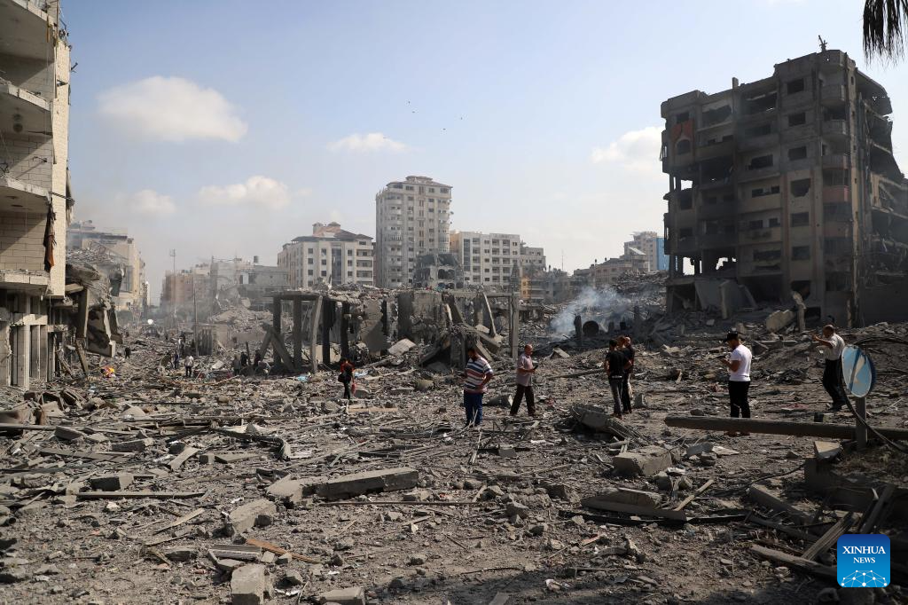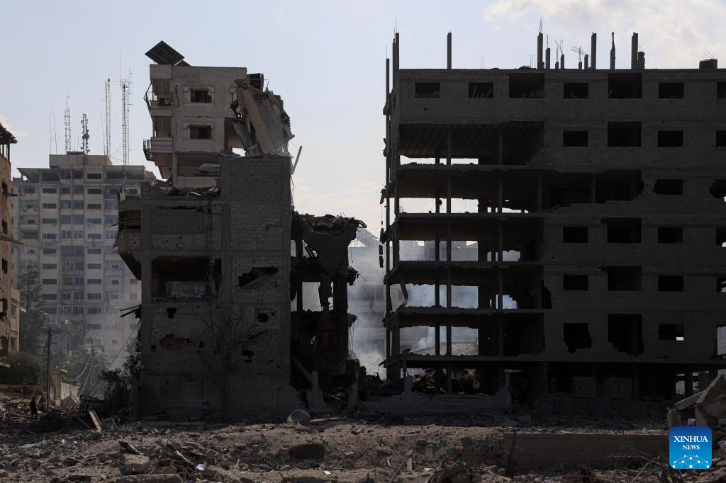This photo taken on Oct. 10, 2023 shows destroyed buildings following an Israeli airstrike in Gaza City. The death toll and injuries from Israeli attacks on the Gaza Strip have risen to 687 and 3,726, respectively, according to the latest update by the Palestinian Health Ministry on Monday. (Photo by Rizek Abdeljawad/Xinhua)