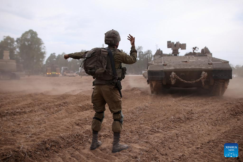 This photo taken on Oct. 9, 2023 shows an Israeli tank at the Israel-Gaza border. (Ilan Assayag/JINI via Xinhua)