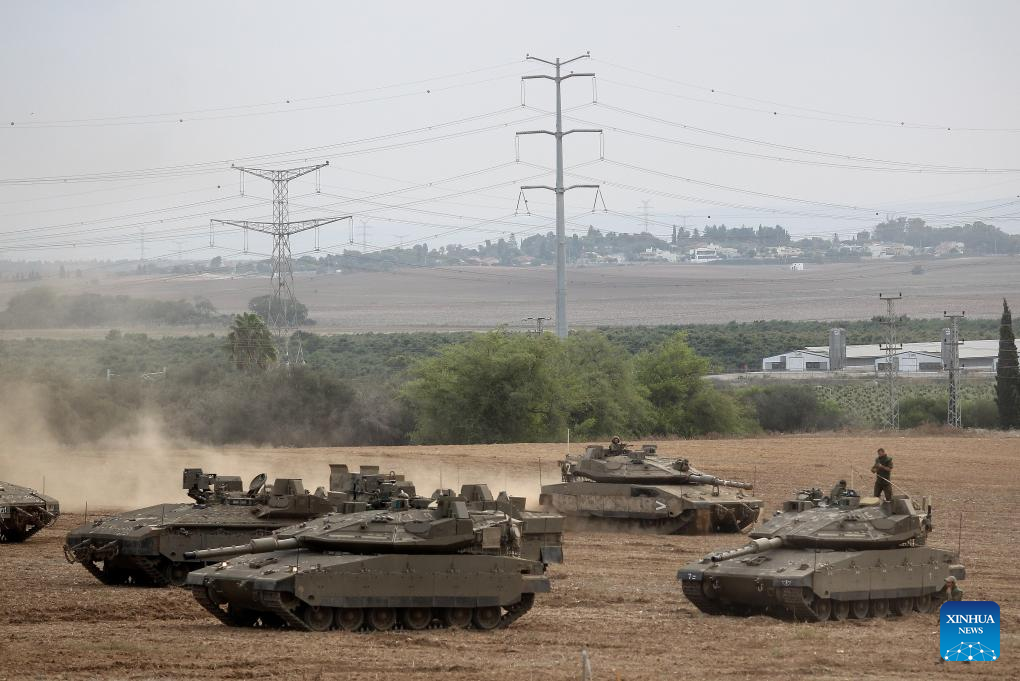This photo taken on Oct. 9, 2023 shows Israeli tanks at the Israel-Gaza border. (Ilan Assayag/JINI via Xinhua)
