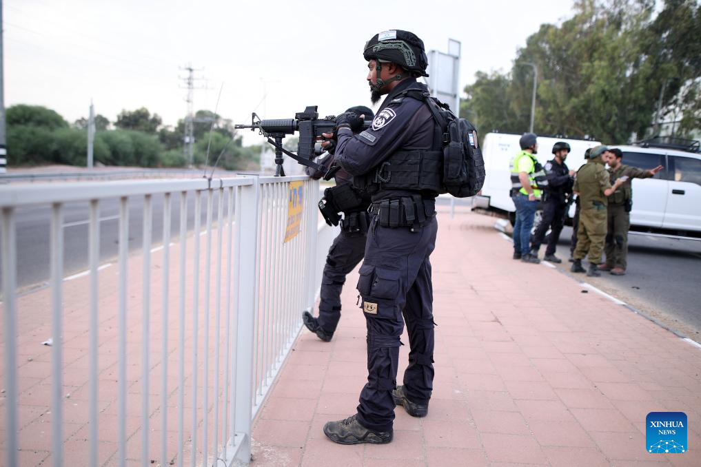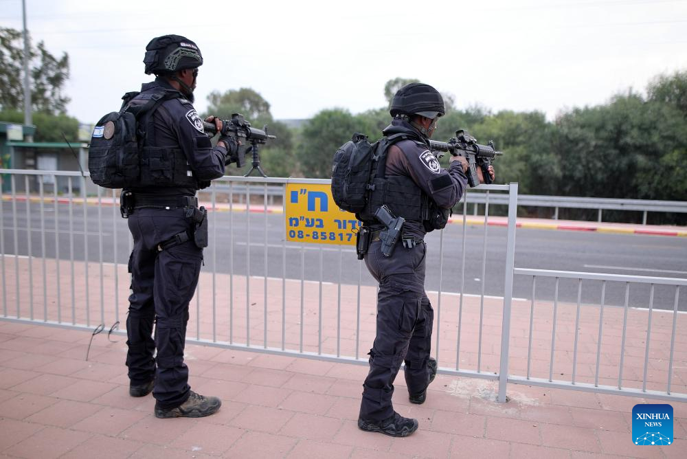 Israeli police officers stand guard in Sderot, southern Israel, Oct. 9, 2023. (Ilan Assayag/JINI via Xinhua)