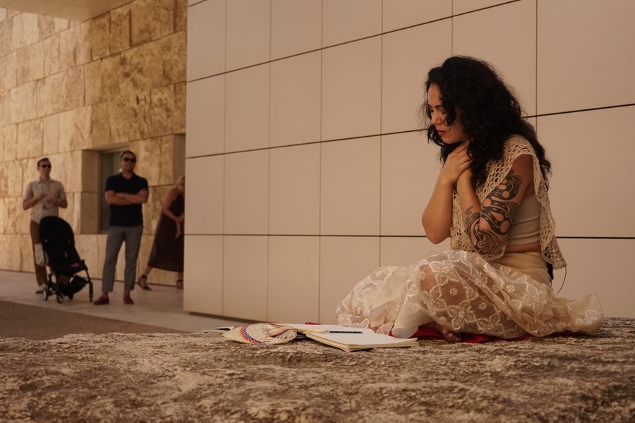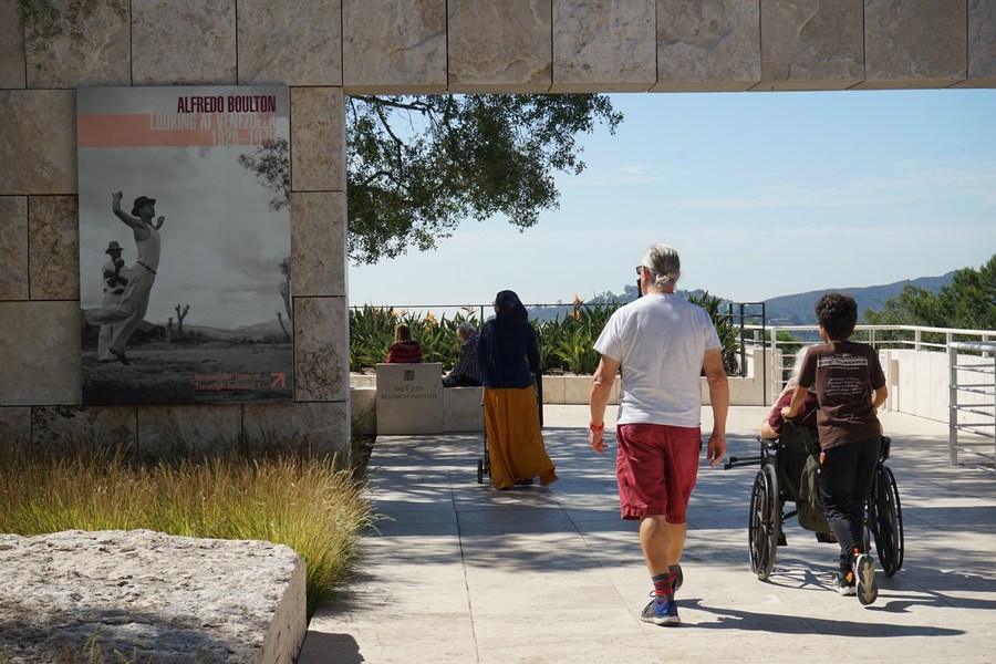 People arrive at the Getty Center to celebrate Indigenous Peoples' Day in Los Angeles, California, the United States, Oct. 7, 2023. (Photo by Zeng Hui/Xinhua)