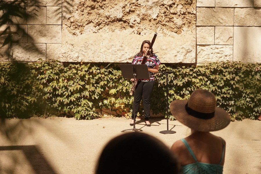 Visitors enjoy artist performance to celebrate Indigenous Peoples' Day in Los Angeles, California, the United States, Oct. 7, 2023. (Photo by Zeng Hui/Xinhua)
