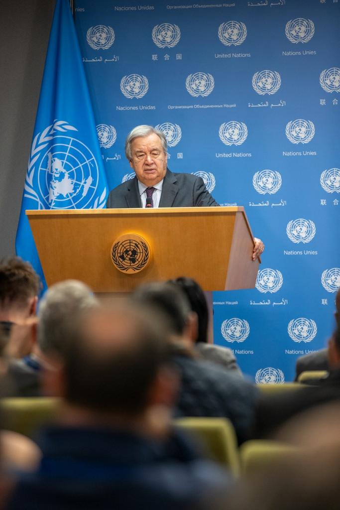 UN Secretary-General Antonio Guterres speaks during a press briefing at the UN headquarters in New York, on Oct. 9, 2023. (Paulo Filgueiras/UN Photo/Handout via Xinhua)