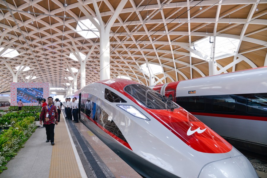 This photo shows high-speed electrical multiple unit (EMU) trains of the Jakarta-Bandung High-Speed Railway at Halim Station in Jakarta, Indonesia, Oct. 2, 2023. (Xinhua/Xu Qin)