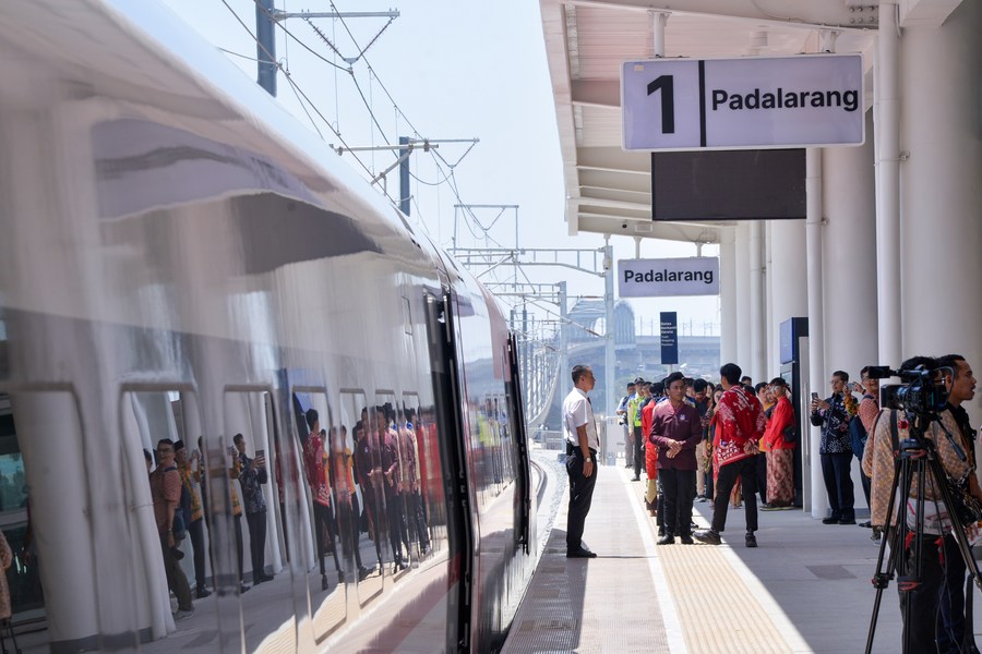 A high-speed electric multiple unit (EMU) train for the Jakarta-Bandung High-Speed Railway stops at Padalarang Station in Padalarang, Indonesia, Oct. 2, 2023. (Xinhua/Xu Qin)