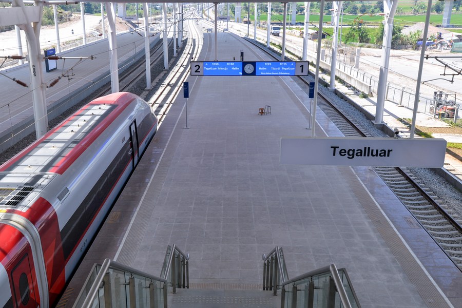 A high-speed electrical multiple unit (EMU) train stops at Tegalluar Station in Bandung, Indonesia, Sept. 1, 2023. (Xinhua/Xu Qin)