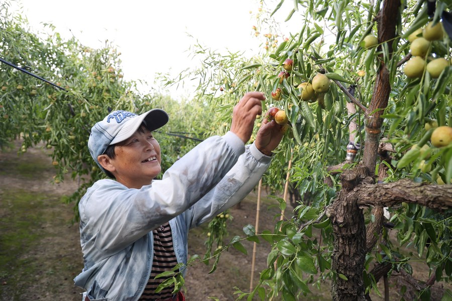 An orchardist picks winter jujubes in Zhanhua District of Binzhou, east China's Shandong Province, Sept. 20, 2023. (Xinhua/Gao Tian)