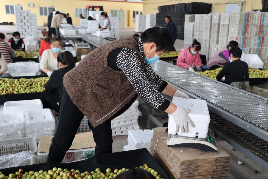 Workers package winter jujubes in Zhanhua District of Binzhou, east China's Shandong Province, Sept. 20, 2023. (Xinhua/Gao Tian)
