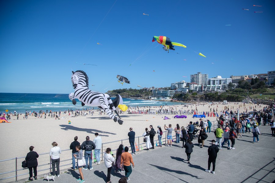 People fly kites at Bondi Beach in Sydney, Australia, Sept. 10, 2023. (Photo by Hu Jingchen/Xinhua)