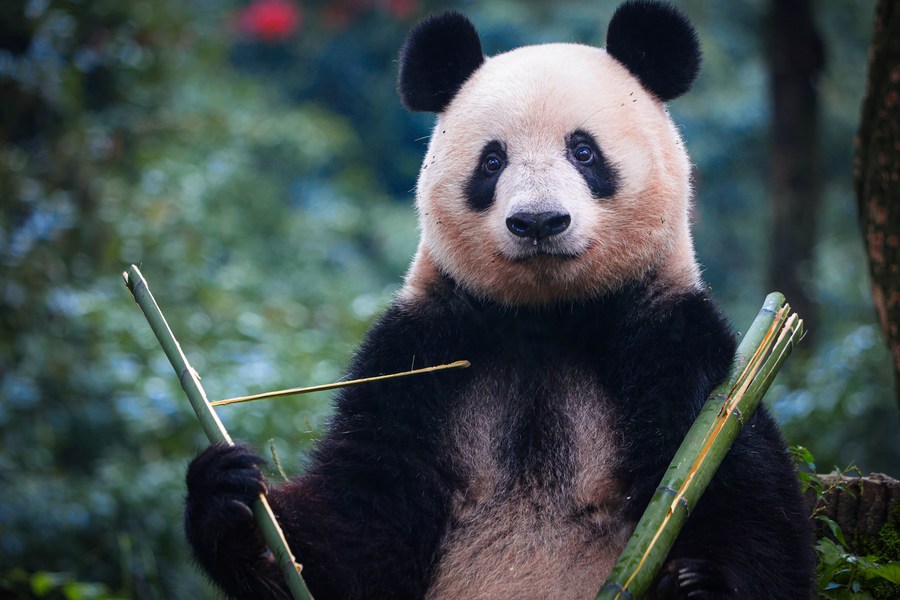 Giant panda Xiang Xiang eats fresh bamboo at the Bifengxia Giant Panda Base in Ya'an, southwest China's Sichuan Province, Oct. 8, 2023. (Photo by Chen Juwei/Xinhua)