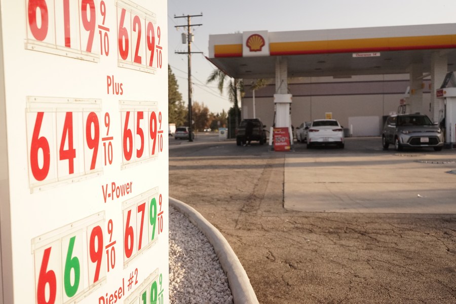 Gas prices are displayed at a gas station in El Monte, Los Angeles County, California, the United States, on Sept. 28, 2023. (Photo by Zeng Hui/Xinhua)