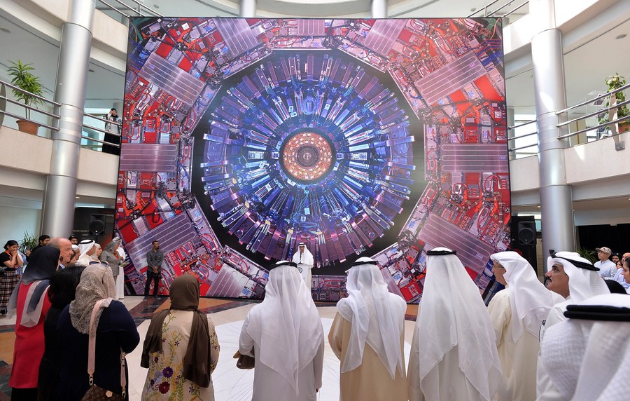 People visit a science exhibition on activities of European Organization for Nuclear Research (CERN) in Kuwait City, Kuwait, Nov. 11, 2019. (Photo by Asad/Xinhua)