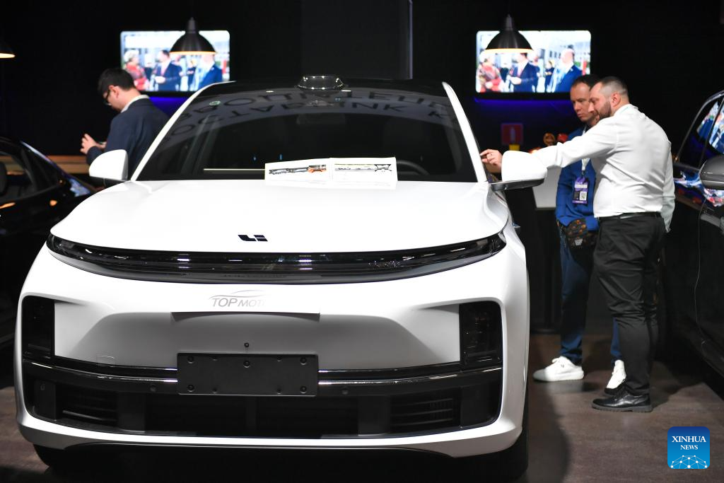 Visitors look at a car from Chinese car brand Li Auto during the CarX exhibition-forum in Moscow, Russia, on Oct. 10, 2023. The event was held here from Tuesday to Wednesday. (Photo by Alexander Zemlianichenko Jr/Xinhua)