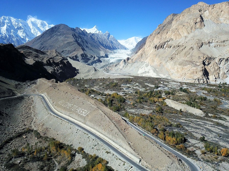 Photo taken on Oct. 16, 2020 shows a view of the Karakoram Highway (KKH) in Pakistan's northern Gilgit-Baltistan region. The Karakoram Highway (KKH) is the only land route linking Pakistan with China. One of the world's highest paved roads, the KKH crosses the Karakoram, the Hindu Kush and the Himalaya mountains and is considered a miracle in the road-building history of mankind. (Xinhua/Liu Tian)