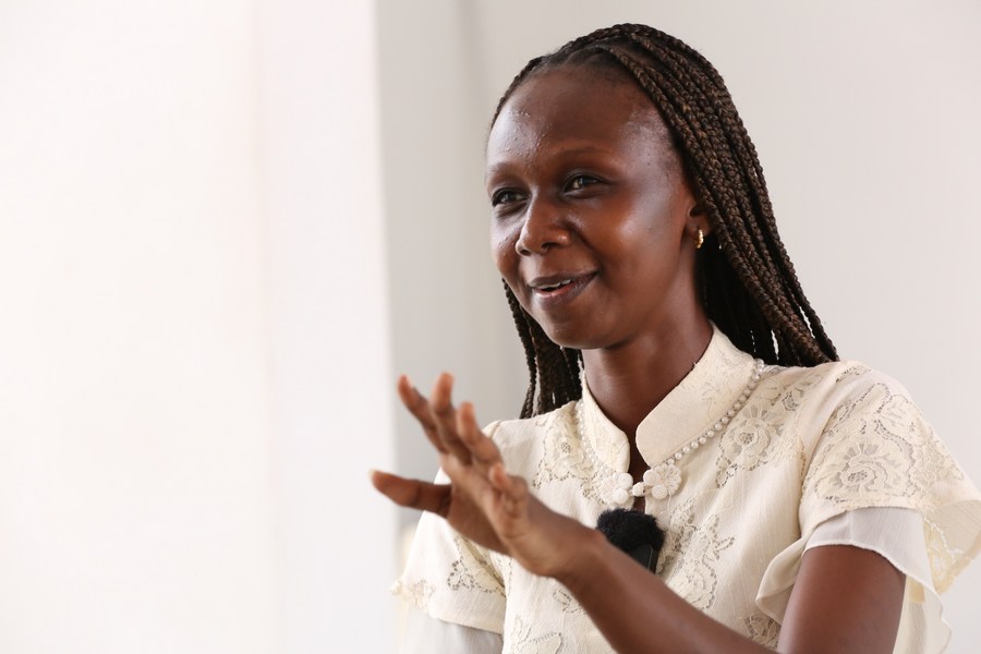 Sharon Emmanuel Munisi, a student at the University of Dar es Salaam, gestures in an interview with Xinhua in Dar es Salaam, Tanzania, Oct. 10, 2023. (Photo by Herman Emmanuel/Xinhua)