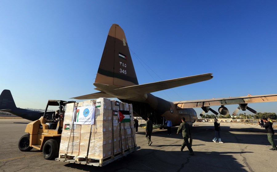 AMMAN, Oct. 12 (Xinhua) -- Jordan on Thursday dispatched a plane with humanitarian aid including essential medical supplies to the Gaza Strip.