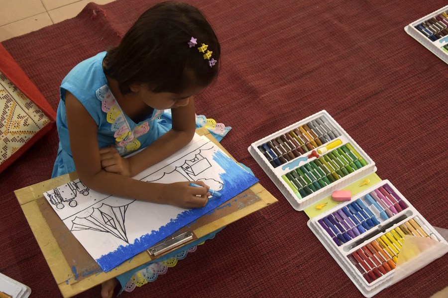 A child draws during the 22nd Dreamland China Bangladesh Children Art Competition-2023 in Dhaka, Bangladesh, on Oct. 8, 2023. (Xinhua)