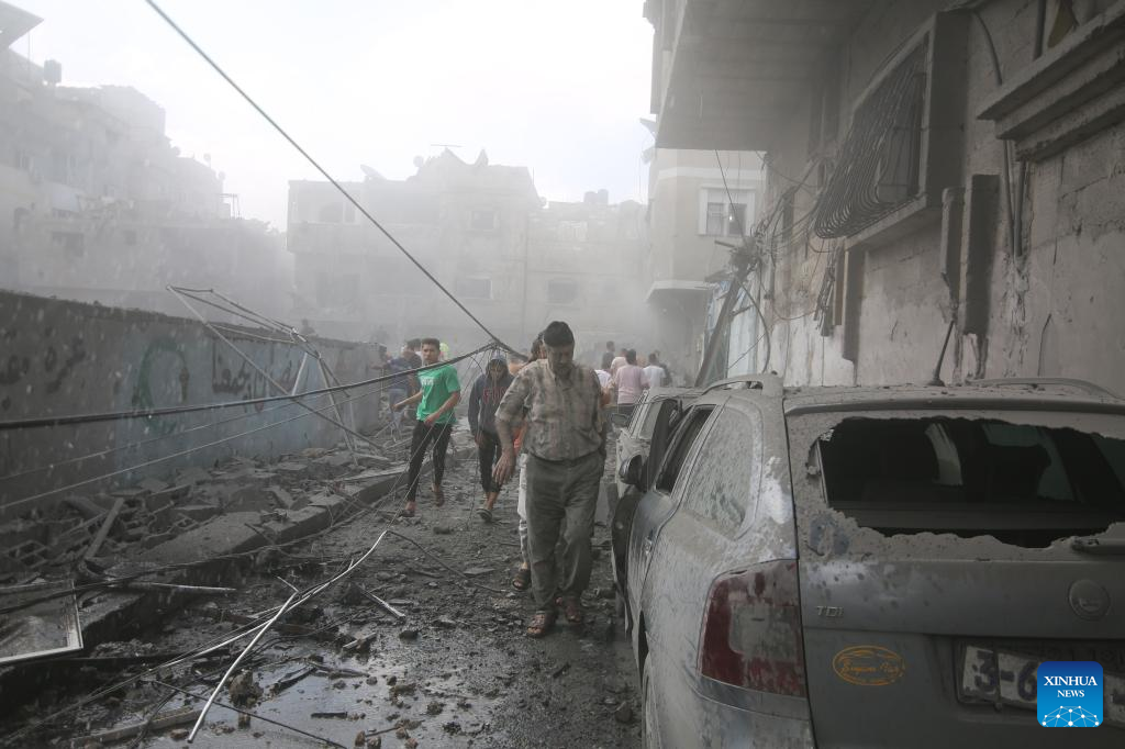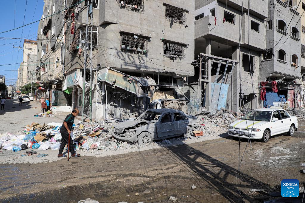 People walk past a building destroyed in an Israeli airstrike at Al-Shati refugee camp in Gaza City, on Oct. 12, 2023. The death toll of the Palestinians from the ongoing Israeli strikes on Gaza hit 1,417, while another 6,268 were wounded, according to the Gaza-based health ministry. (Photo by Rizek Abdeljawad/Xinhua)