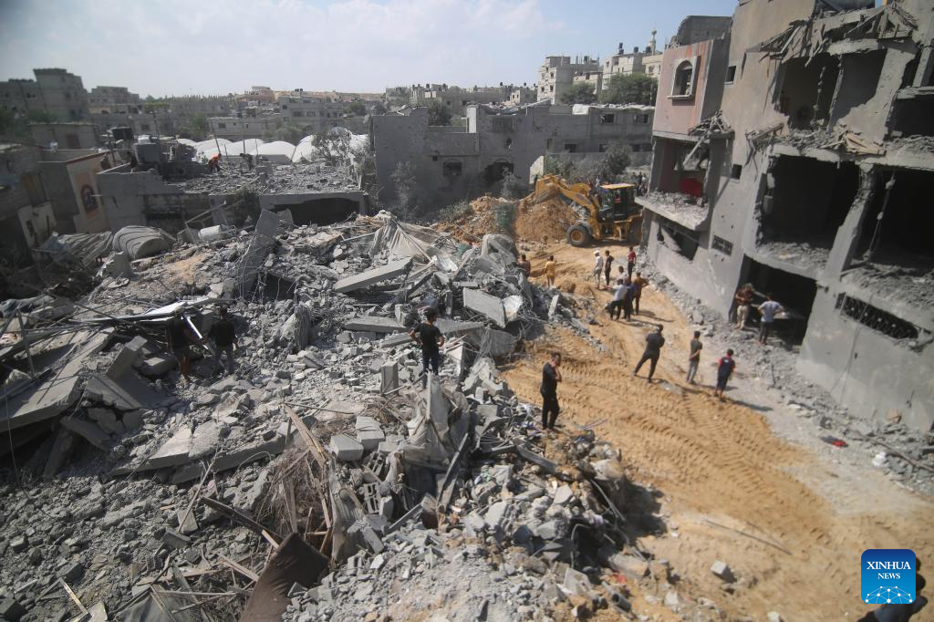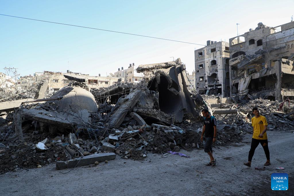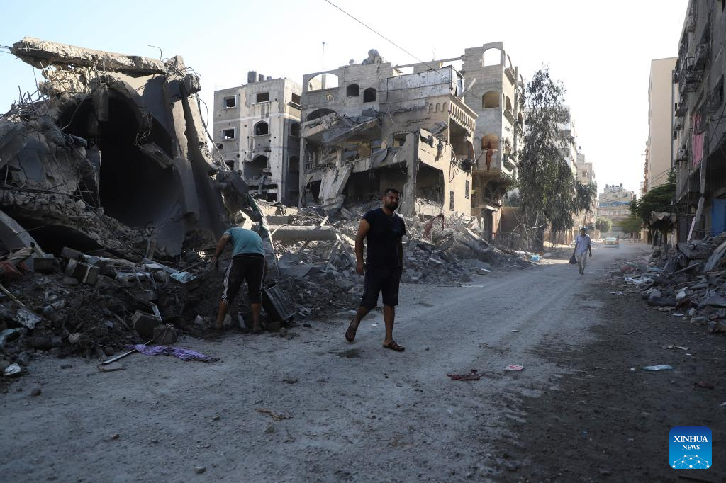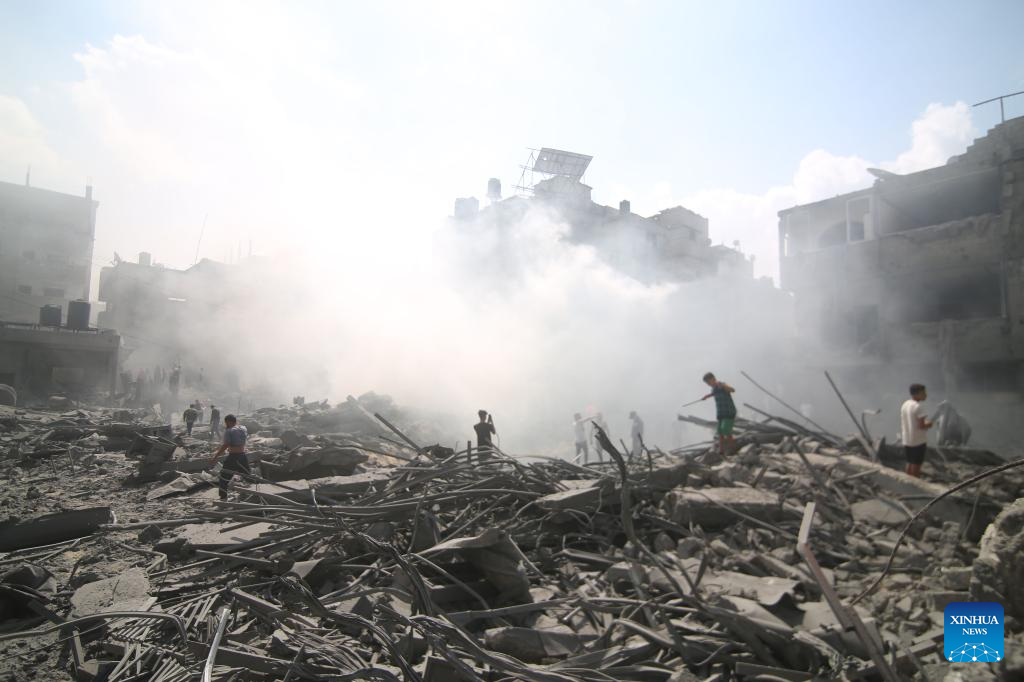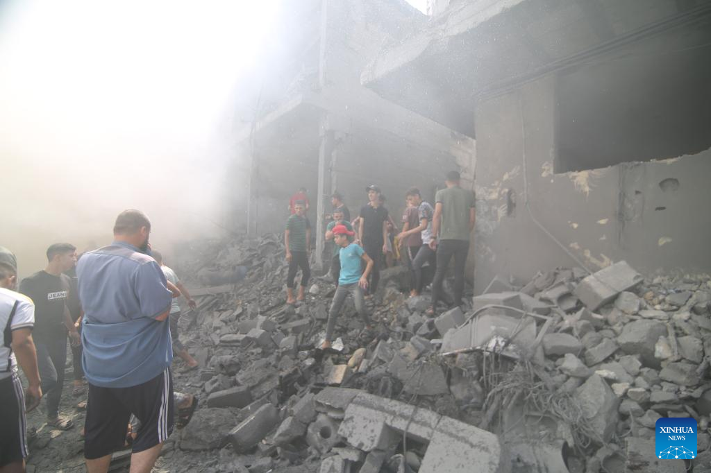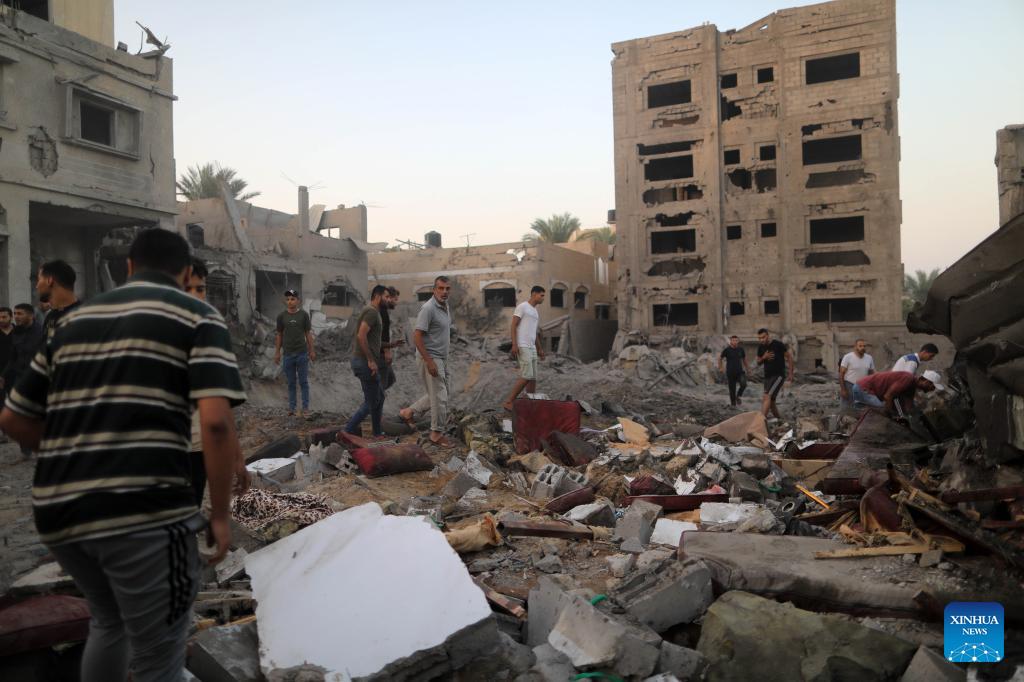People inspect buildings destroyed in Israeli airstrikes in the southern Gaza Strip city of Khan Younis, on Oct. 12, 2023. The death toll of the Palestinians from the ongoing Israeli strikes on Gaza hit 1,417, while another 6,268 were wounded, according to the Gaza-based health ministry. (Photo by Yasser Qudih/Xinhua)