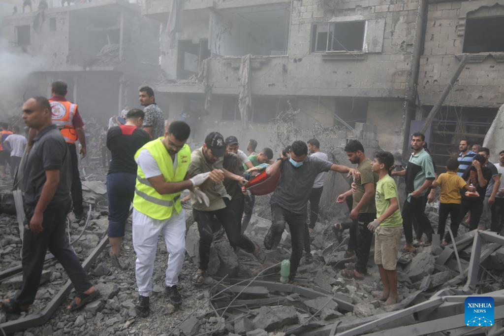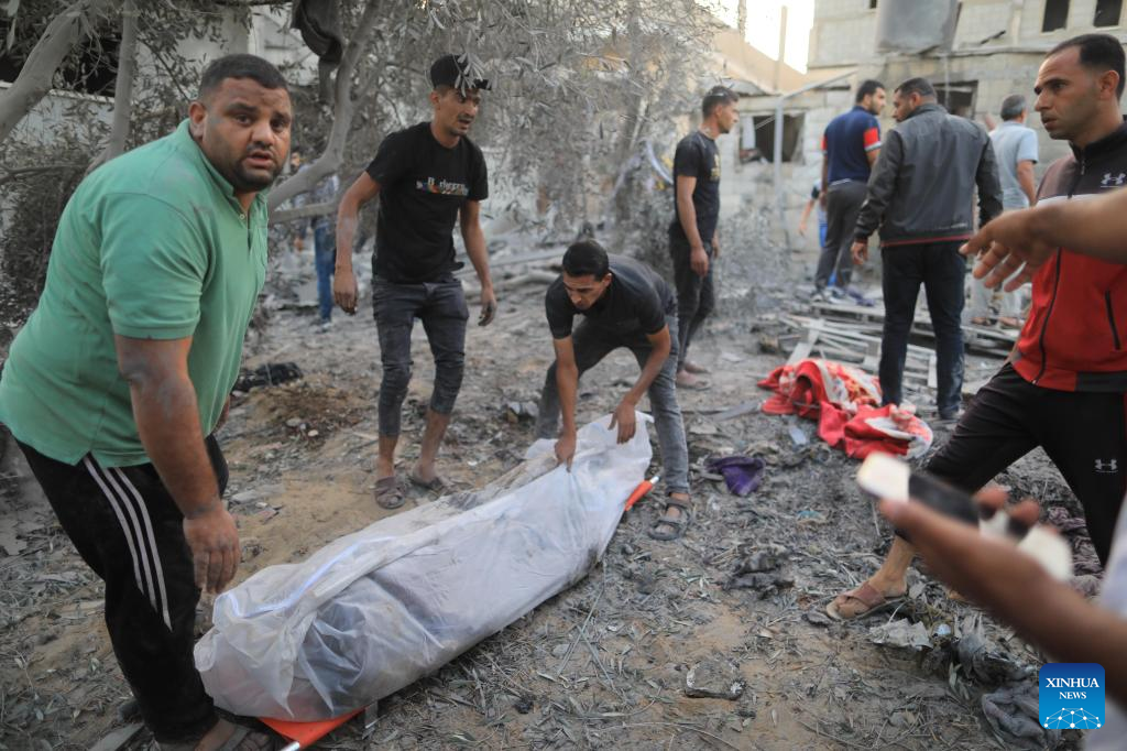 People remove the body of a victim from a building destroyed in Israeli airstrikes in the southern Gaza Strip city of Khan Younis, on Oct. 12, 2023. The death toll of the Palestinians from the ongoing Israeli strikes on Gaza hit 1,417, while another 6,268 were wounded, according to the Gaza-based health ministry. (Photo by Yasser Qudih/Xinhua)