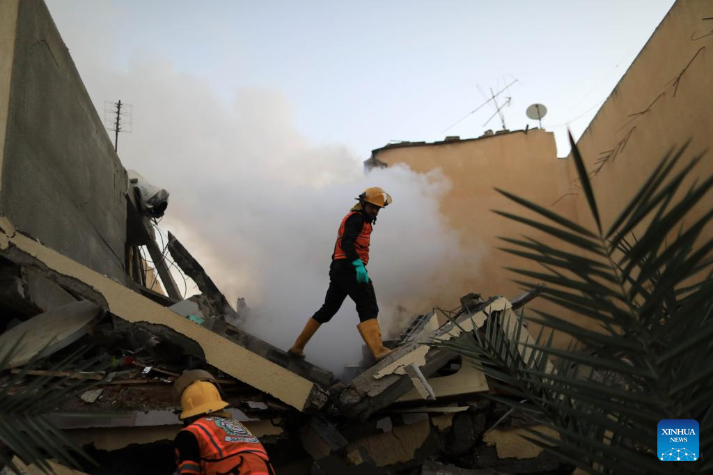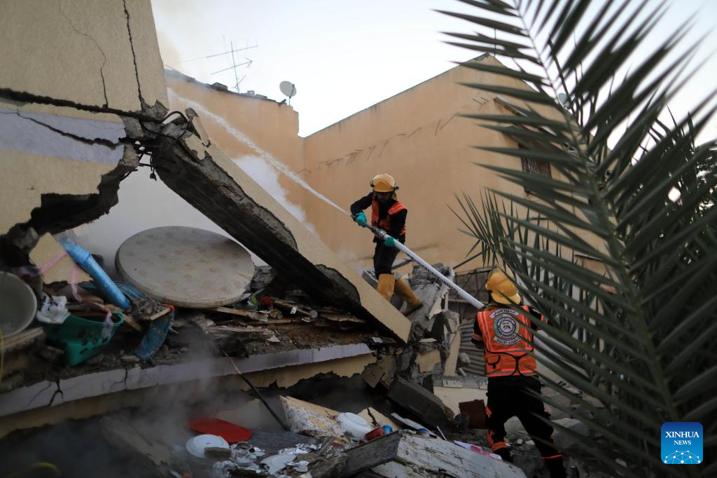 Members of the Palestinian Civil Defense try to extinguish a fire at buildings destroyed in Israeli airstrikes in the southern Gaza Strip city of Khan Younis, on Oct. 12, 2023. The death toll of the Palestinians from the ongoing Israeli strikes on Gaza hit 1,417, while another 6,268 were wounded, according to the Gaza-based health ministry. (Photo by Yasser Qudih/Xinhua)