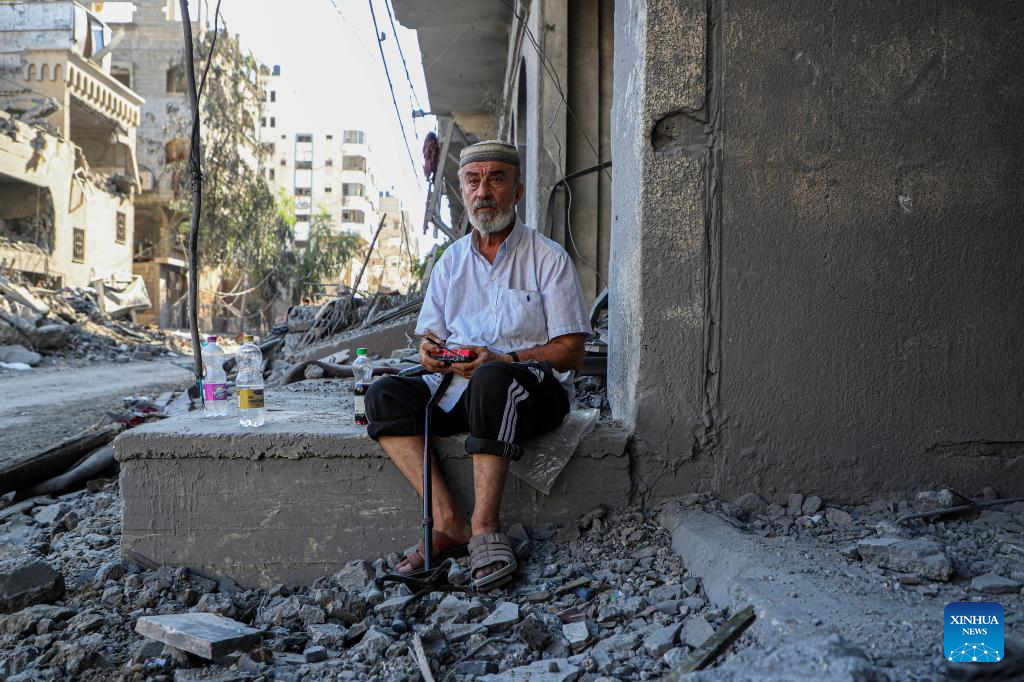 A man sits near a building destroyed in an Israeli airstrike at Al-Shati refugee camp in Gaza City, on Oct. 12, 2023. The death toll of the Palestinians from the ongoing Israeli strikes on Gaza hit 1,417, while another 6,268 were wounded, according to the Gaza-based health ministry. (Photo by Rizek Abdeljawad/Xinhua)