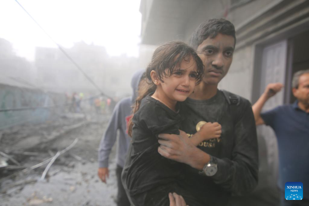 A man holds a girl in his arms and evacuates from a building destroyed in Israeli airstrikes in the southern Gaza Strip city of Rafah, on Oct. 12, 2023. The death toll of the Palestinians from the ongoing Israeli strikes on Gaza hit 1,417, while another 6,268 were wounded, according to the Gaza-based health ministry. (Photo by Khaled Omar/Xinhua)