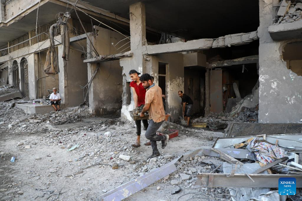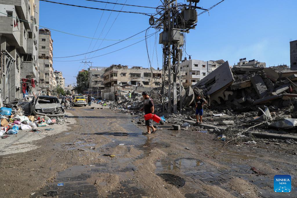 People remove rubbles of a building destroyed in an Israeli airstrike at Al-Shati refugee camp in Gaza City, on Oct. 12, 2023. The death toll of the Palestinians from the ongoing Israeli strikes on Gaza hit 1,417, while another 6,268 were wounded, according to the Gaza-based health ministry. (Photo by Rizek Abdeljawad/Xinhua)