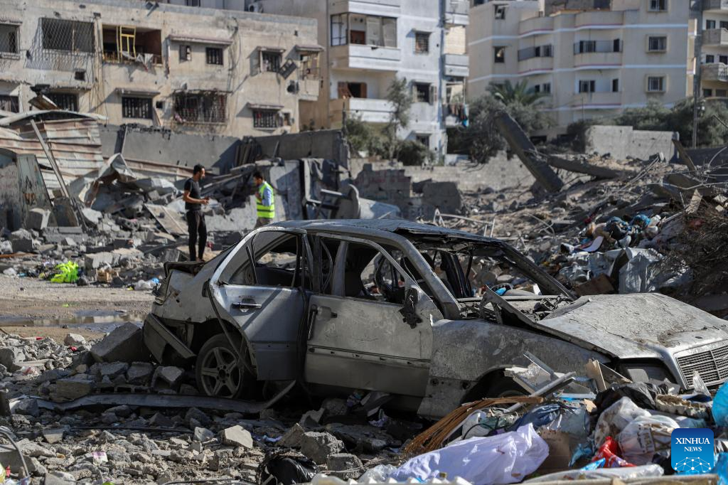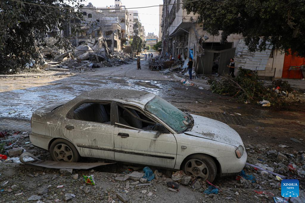 A vehicle destroyed in an Israeli airstrike is seen at Al-Shati refugee camp in Gaza City, on Oct. 12, 2023. The death toll of the Palestinians from the ongoing Israeli strikes on Gaza hit 1,417, while another 6,268 were wounded, according to the Gaza-based health ministry. (Photo by Rizek Abdeljawad/Xinhua)
