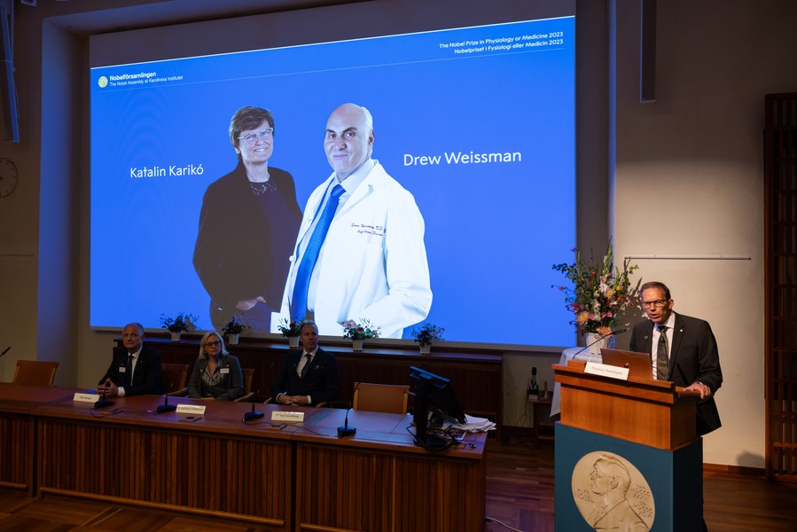 The announcement of the 2023 Nobel Prize in Physiology or Medicine is held at the Karolinska Institute in Stockholm, Sweden, on Oct. 2, 2023. (Photo by Wei Xuechao/Xinhua)