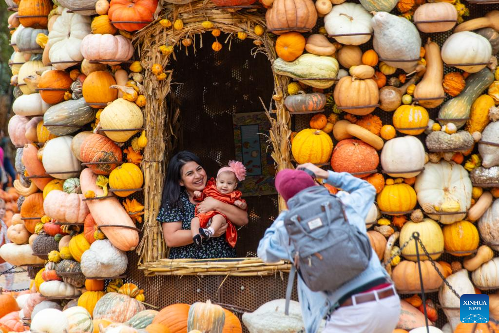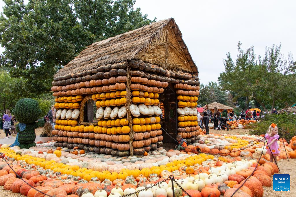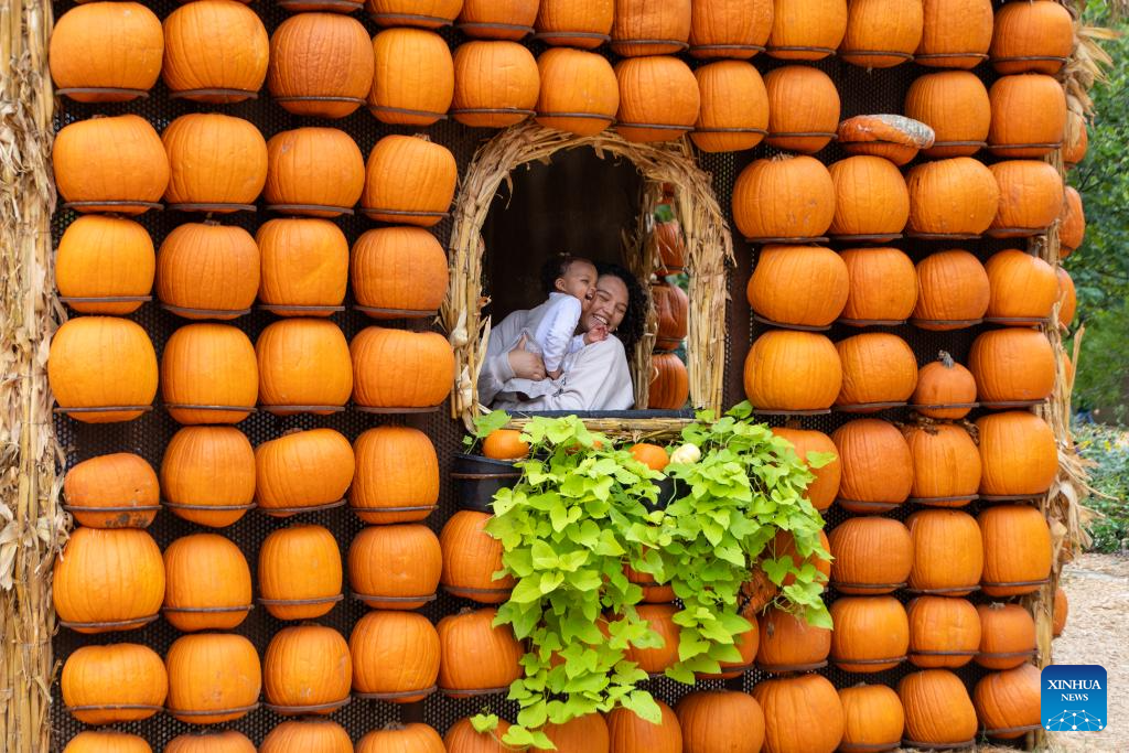 People visit a pumpkin house in Dallas Arboretum's Pumpkin Village, Texas, the United States, on Oct. 12, 2023. The nationally-acclaimed Pumpkin Village at Dallas Arboretum features pumpkin houses and creative displays fashioned from more than 100,000 pumpkins, gourds and squash. (Photo by Dan Tian/Xinhua)