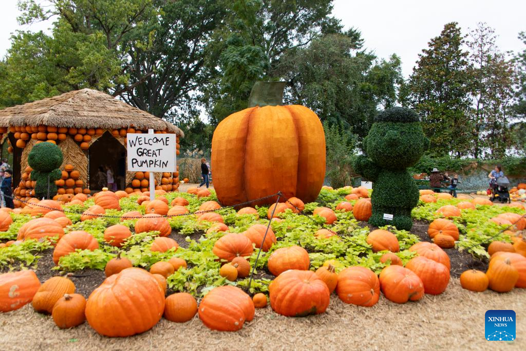 A great pumpkin is displayed in Dallas Arboretum's Pumpkin Village, Texas, the United States, on Oct. 12, 2023. The nationally-acclaimed Pumpkin Village at Dallas Arboretum features pumpkin houses and creative displays fashioned from more than 100,000 pumpkins, gourds and squash. (Photo by Dan Tian/Xinhua)