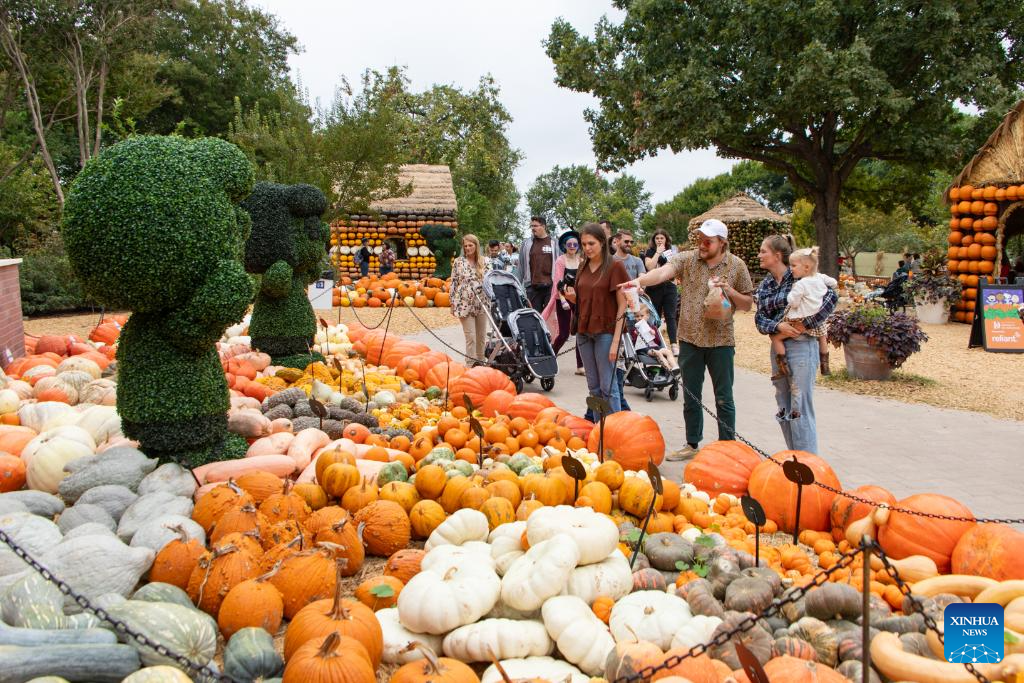 People look at pumpkins in Dallas Arboretum's Pumpkin Village, Texas, the United States, on Oct. 12, 2023. The nationally-acclaimed Pumpkin Village at Dallas Arboretum features pumpkin houses and creative displays fashioned from more than 100,000 pumpkins, gourds and squash. (Photo by Dan Tian/Xinhua)