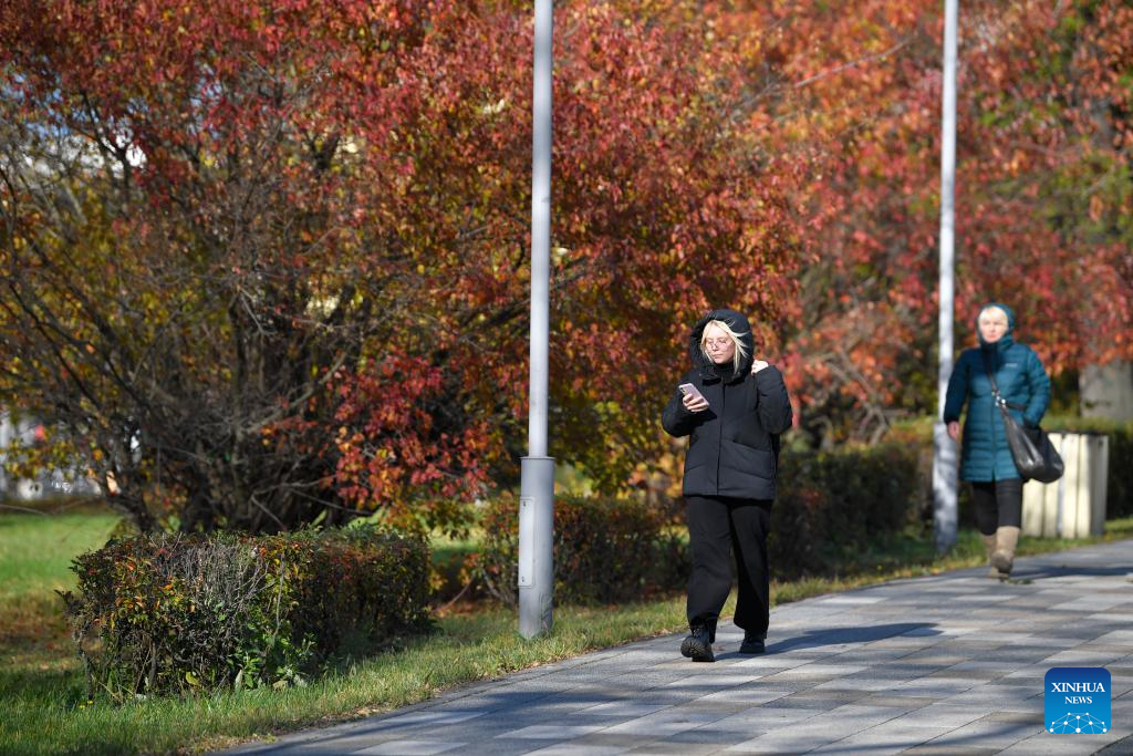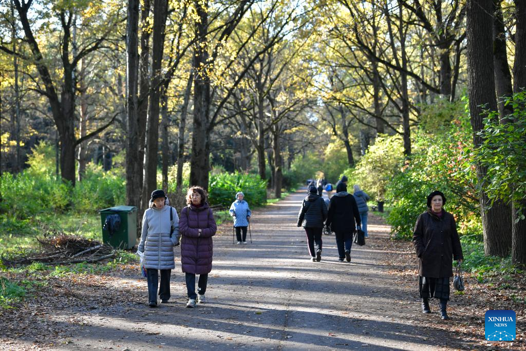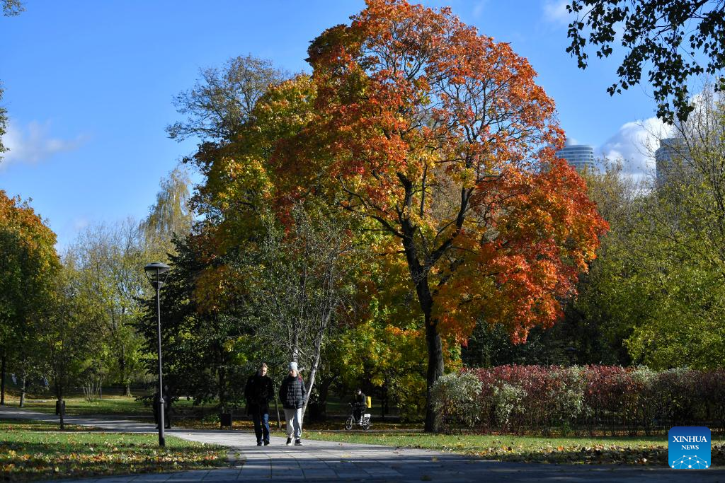 People enjoy an autumn walk in a park in Moscow, Russia, Oct. 13, 2023. (Photo by Alexander Zemlianichenko Jr/Xinhua)