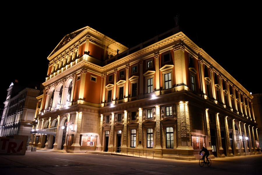This photo taken on Oct. 5, 2023 shows a night view of the Wiener Musikverein building in Vienna, Austria. The annual Vienna Philharmonic New Year's Concert is held in the Golden Hall located in the building. (Photo by Han Lu/Xinhua)