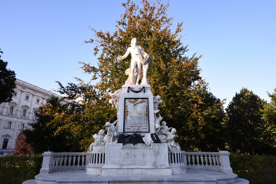 This photo taken on Sept. 7, 2023 shows a monument of Wolfgang Amadeus Mozart in Vienna, Austria. (Xinhua/He Canling)