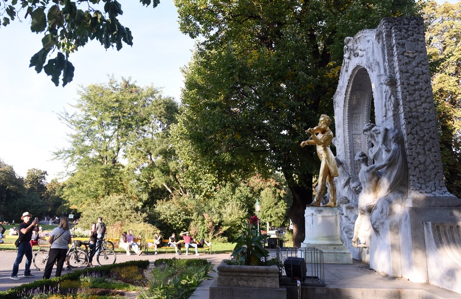 Tourists take photos of a statue of Johann Strauss Jr. in Vienna, Austria, Oct. 2, 2023. (Photo by Han Lu/Xinhua)