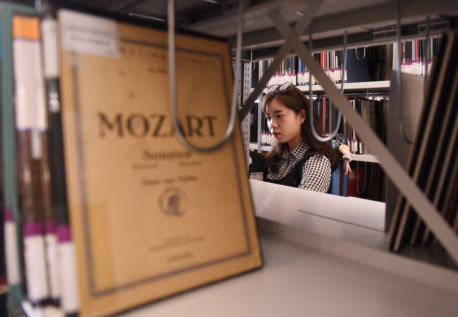 Chinese student Huang Yunwen selects books in a library of the University of Music and Performing Arts Vienna in Vienna, Austria, Sept. 13, 2023. (Photo by Han Lu/Xinhua)