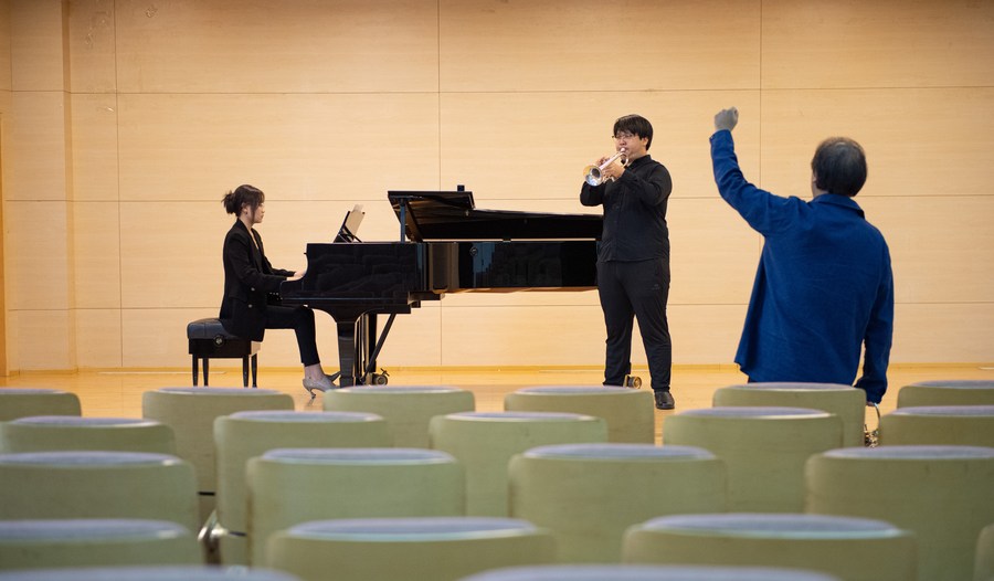 Professor Chen Guang (R) instructs as a student practices "Trumpet Concerto in E-flat Major" by Franz Joseph Haydn at the Central Conservatory of Music in Beijing, China, Sept. 14, 2023. (Xinhua/Chen Zhonghao)