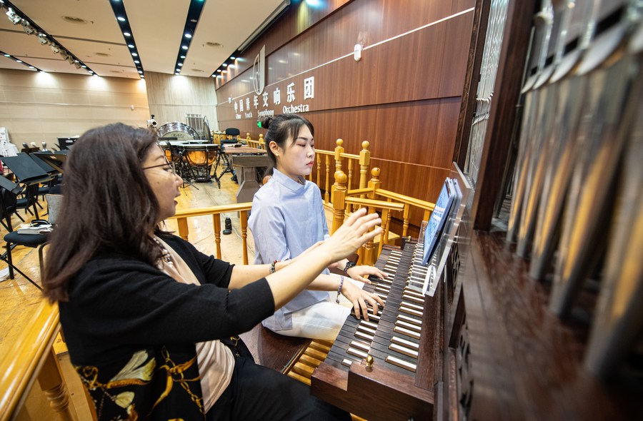 Professor Shen Fanxiu (L) instructs as a student practices "Fantasy in F Minor, K. 608" by Wolfgang Amadeus Mozart on a pipe organ at Central Conservatory of Music in Beijing, China, on Sept. 14, 2023. (Xinhua/Chen Zhonghao)