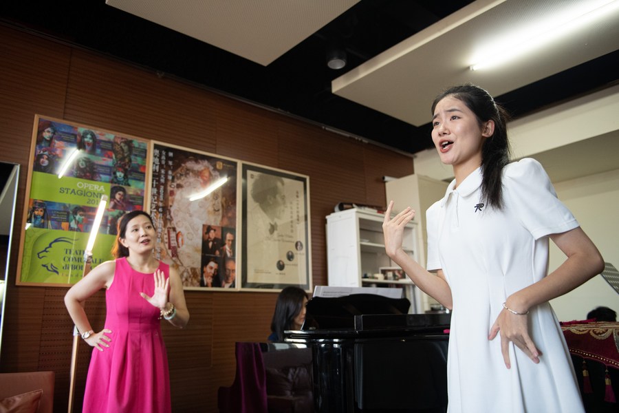 Song Yuanming (L) looks on as a student practices the operetta "Die Fledermaus" by Johann Strauss Jr. at the Central Conservatory of Music in Beijing, China, Sept. 14, 2023. (Xinhua/Chen Zhonghao)