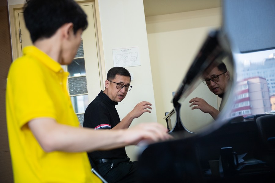 Professor Wei Danwen (back) explains as a student practices "Piano Concerto No. 12 in A major, K. 414" by Wolfgang Amadeus Mozart at the Central Conservatory of Music in Beijing, capital of China, Sept. 14, 2023. (Xinhua/Chen Zhonghao)