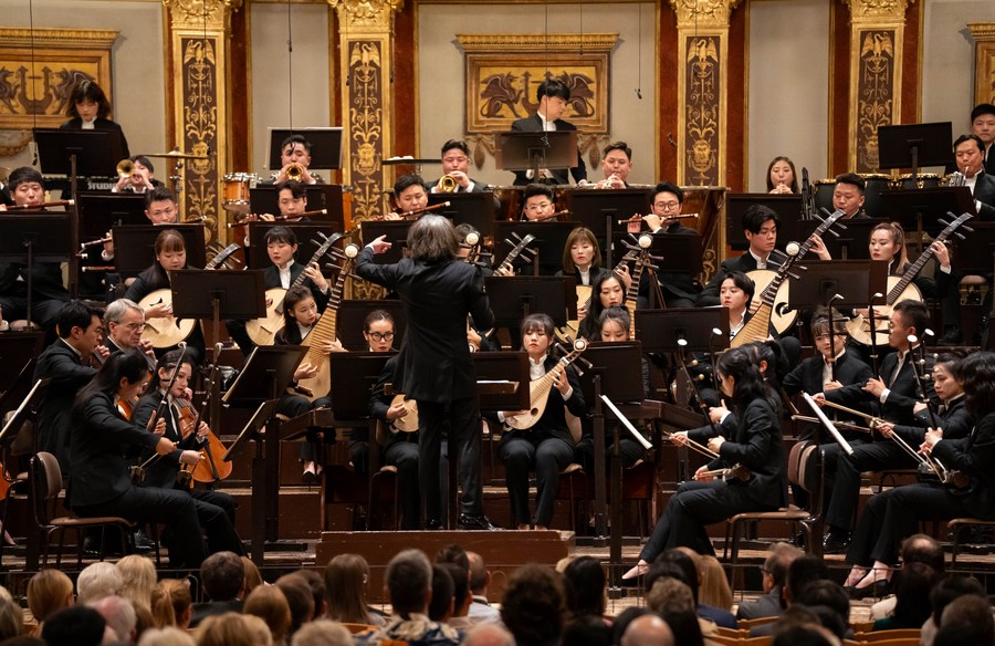 This photo taken on Sept. 25, 2023 shows a Chinese orchestral works concert performed by Suzhou Chinese Orchestra at the Golden Hall of the Wiener Musikverein in Vienna, Austria. (Suzhou Chinese Orchestra/Handout via Xinhua)