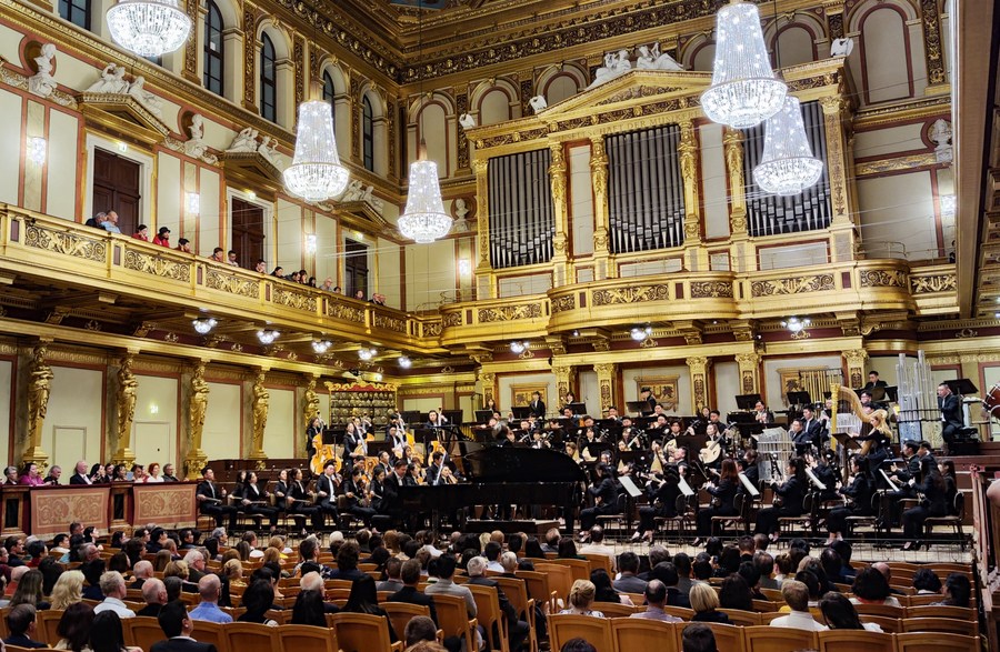 This photo taken on Sept. 24, 2023 shows a Chinese orchestral works concert performed by Suzhou Chinese Orchestra at the Golden Hall of the Wiener Musikverein in Vienna, Austria. (Suzhou Chinese Orchestra/Handout via Xinhua)