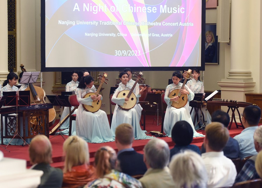 Members of Nanjing University Traditional Chinese Orchestra perform in Graz, Austria, Sept. 30, 2023. (Xinhua/He Canling)