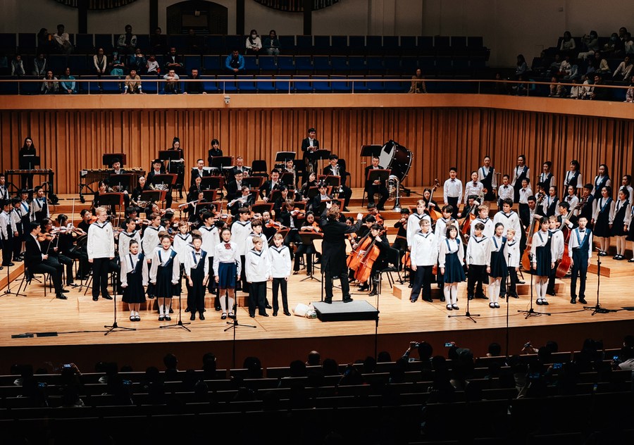 Members of the Vienna Boys' Choir and the Chengdu Friends of Vienna Boys Choir perform in Chengdu, southwest China's Sichuan Province, Oct. 9, 2023. (Xinhua/He Canling)