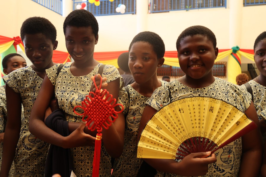 Students pose with Chinese-style artifacts while visiting an exhibition of the Chinese culture week in the University of Cape Coast in Cape Coast, Ghana, on June 17, 2023. (Photo by Seth/Xinhua)