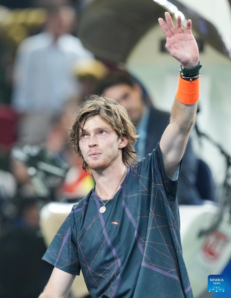 Andrey Rublev of Russia competes during the men's singles semifinal between Grigor Dimitrov of Bulgaria and Andrey Rublev of Russia at the ATP World Tour Shanghai Masters tennis tournament at Qizhong Forest Sports City Arena in Shanghai, east China, Oct. 14, 2023. (Xinhua/Ding Ting)